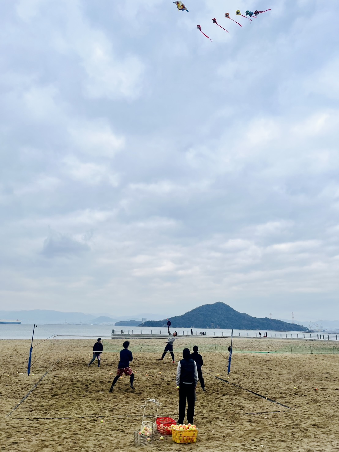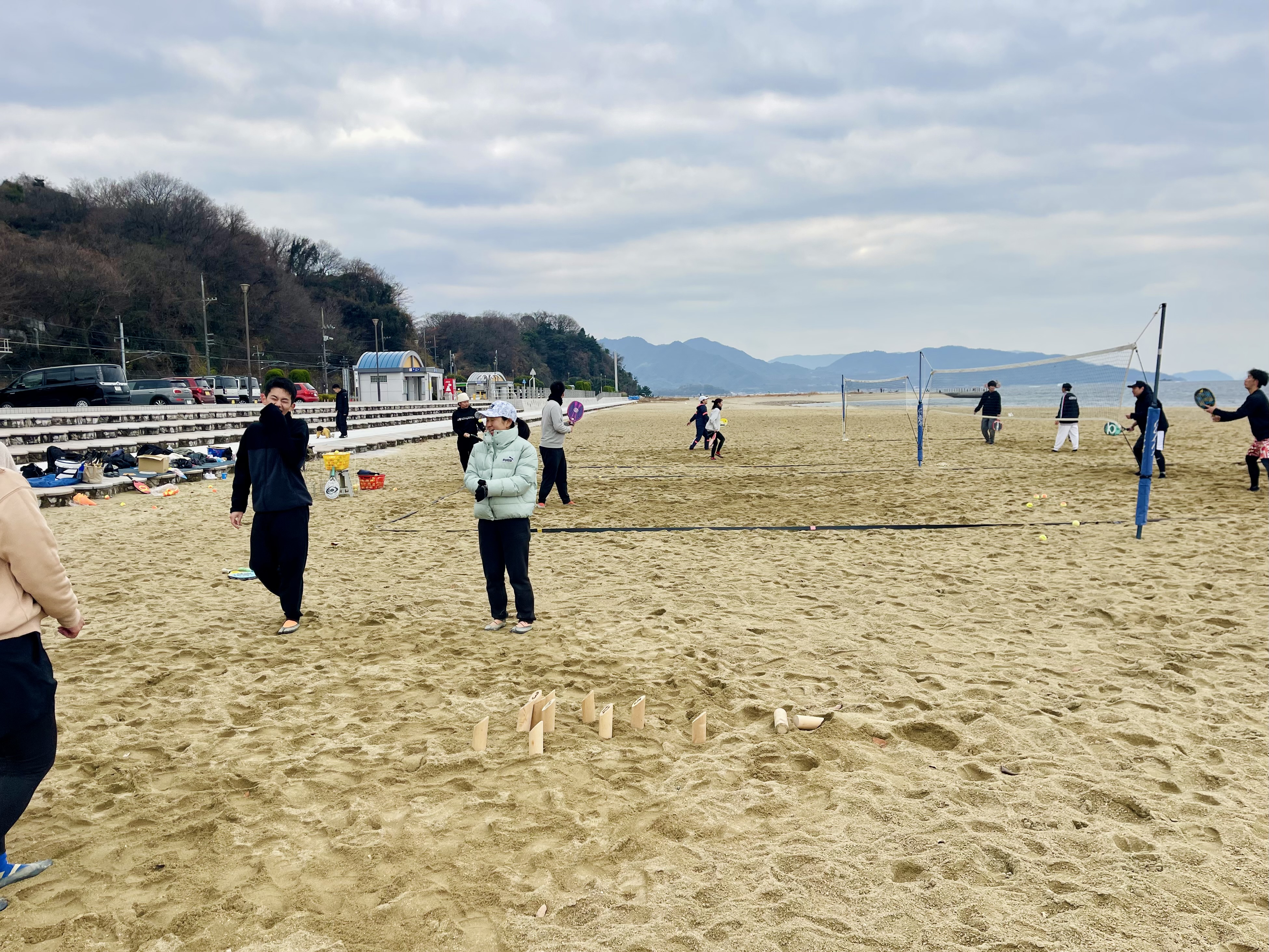 ビーチテニスをしながら、凧揚げ、書初め、モルックをしました!