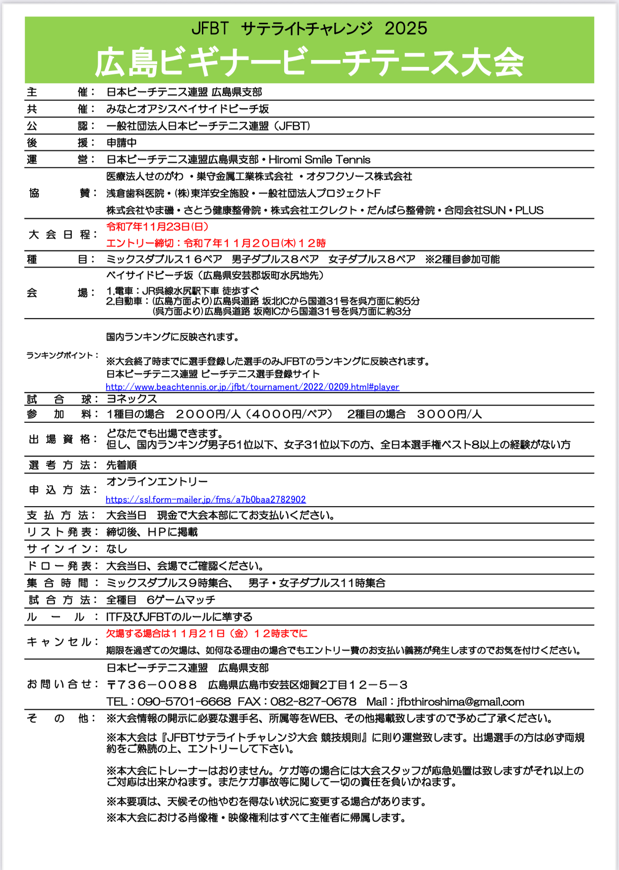 JFBTサテライトチャレンジ2025 広島ビギナービーチテニス大会の開催決定!!